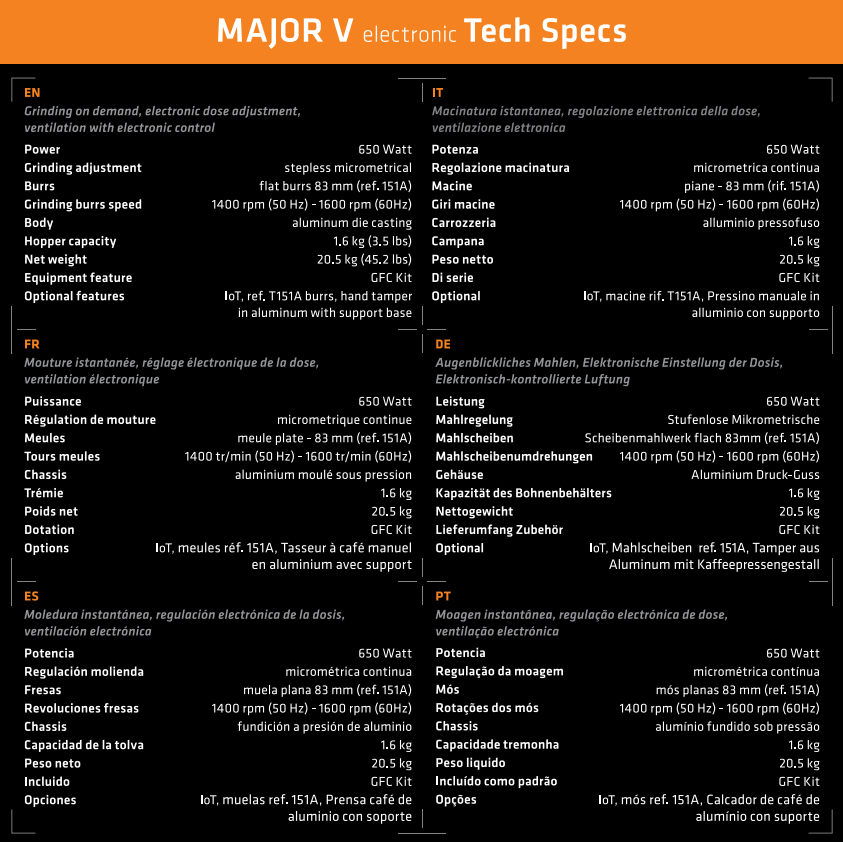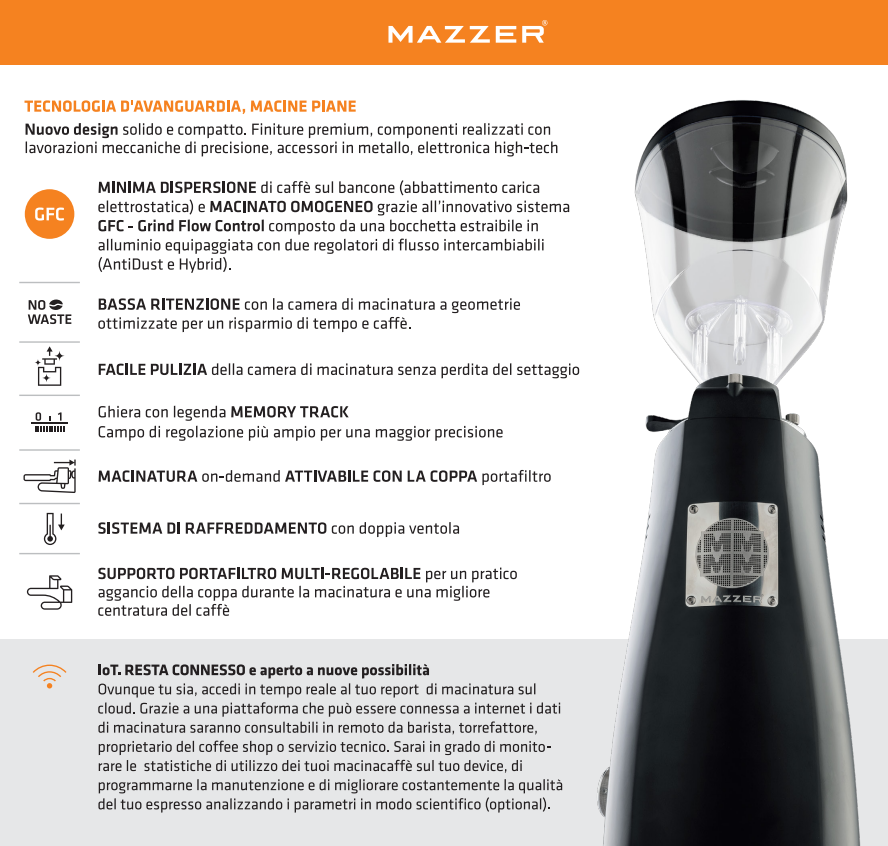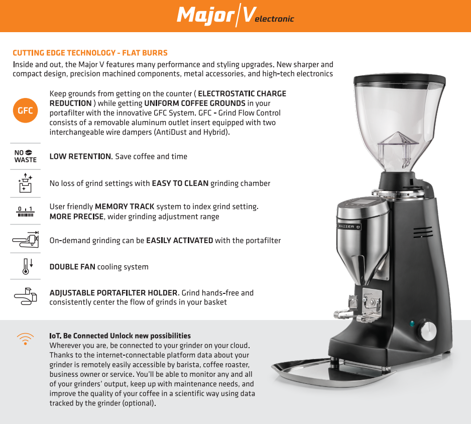 The Mazzer Major V boasts low retention, flexibility to adapt to all situations, and performs well at any time of the day—from the morning rush to regular service. It’s the grinder to have when a coffee shop wants to make the leap to the next level. Major V helps baristas complete their daily work with a user-friendly interface, new electronic features, and IoT optional technology.