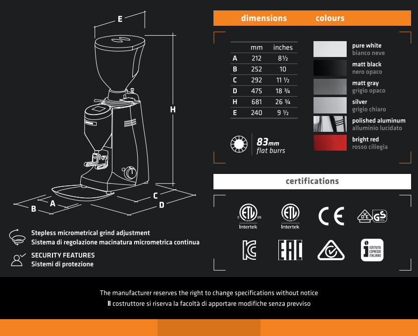 83 mm flat burrs 100% Made in Italy by Mazzer.