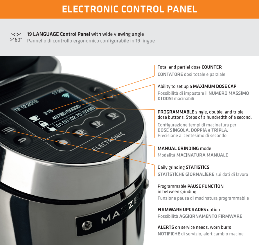 The Mazzer Major V boasts low retention, flexibility to adapt to all situations, and performs well at any time of the day—from the morning rush to regular service. It’s the grinder to have when a coffee shop wants to make the leap to the next level. Major V helps baristas complete their daily work with a user-friendly interface, new electronic features, and IoT optional technology.
